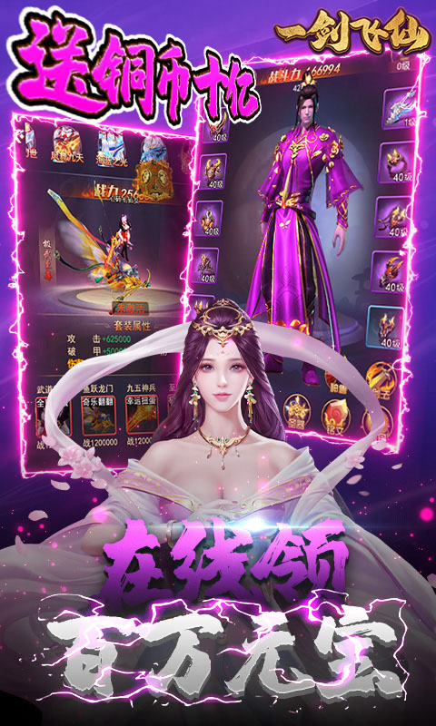 《一剑飞仙(送百万元宝)》是一款以仙侠故事为背景的,以轻松休闲的挂机战斗为主的,2D,H5游戏。以精美萌化的人物模型,华丽的技能效果,多样化的酷炫外观,构建了极具冲击力的视觉盛宴,呈现给玩家一个高品质的仙侠世界。游戏玩法上,以轻松休闲的挂机战斗为主;角色成长方面,提供了丰富的培养系统,变强途径多种多样,玩家随时随地都能感受到成长的快乐;休闲的答题,激烈的BOSS抢夺,多人PVP战斗等活动,同样给用户精彩无限的体验。