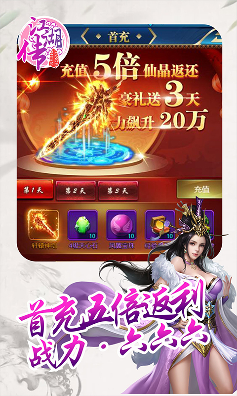 1.充值比例1:3000!!!首次充值,更有5倍元宝返利加持!!