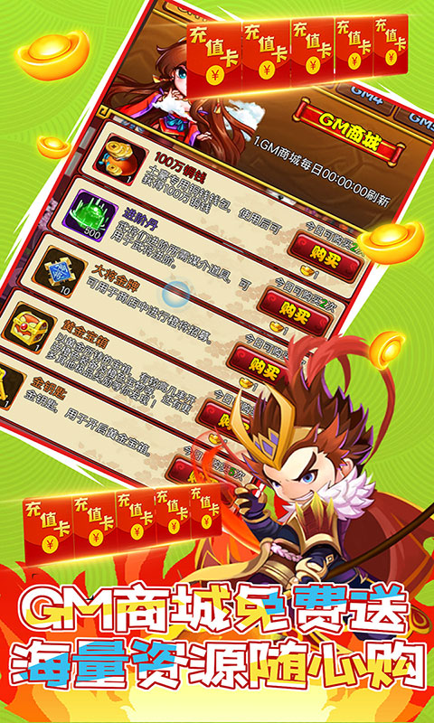3.GM商城每天领取海量资源,充值卡只需1元宝。