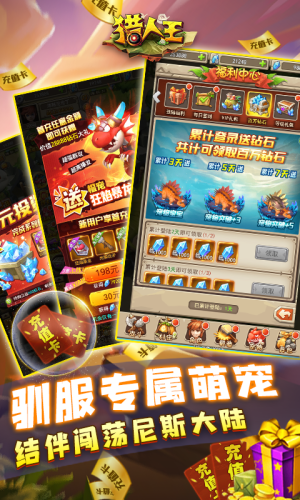 全新原始冒险MMORPG手游《猎人王-送千元充值》参上!它带着原汁原味的经典石器复刻体验迈着稳健的步伐向我们走来了!你看看它的英姿,是如此的熟悉又可爱,瞬间直接将你召唤回童年时那快乐的尼斯大陆,去经历那一场场奇妙惊险的冒险!经典战斗系统踩地雷、宠物抓捕培养、家族家园玩法、跨服组队争霸、竞技PK、首领狩猎,还有那熟悉可玩性极高的猛犸快递玩法,根本停不下来好吗!正所谓,少年弟子江湖老,猎人王我乐逍遥!