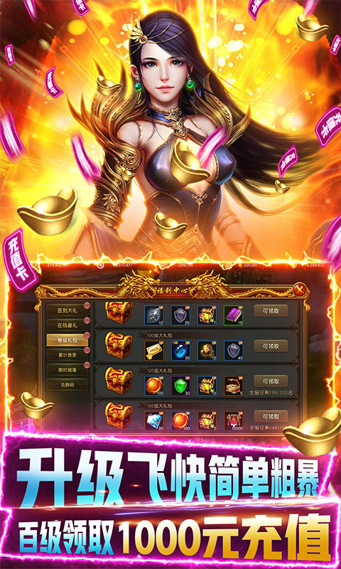 1:上线送V2 88888元宝 下载奖励312充值 100级首充免费领
