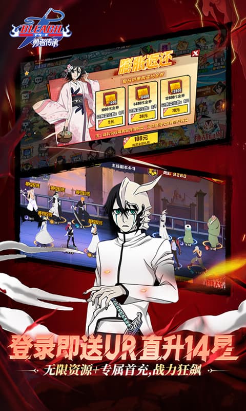 《勇者传承(0.1折送毕业阵容)》是一款以原作中的剧情脉络为核心,对人物、场景进行精细还原,对角色能力、游戏玩法进行深度定制,经典呈现玩家难以忘怀的死神世界。在游戏中,玩家以主角的身份与视角面对强敌、收集资源、磨练技巧,培养自己的最强死神。人气角色大集结,黑崎一护、朽木白哉、朽木露琪亚等数位死神人气角色登场,专属定制技能,每一位登场角色都将给你:“没错,这就是他(她)的感觉!\\\\\\\"。热血沸腾的梦幻对决到放置类游戏轻松休闲,重燃战斗之魂,体验热血酣畅的灵压对决!